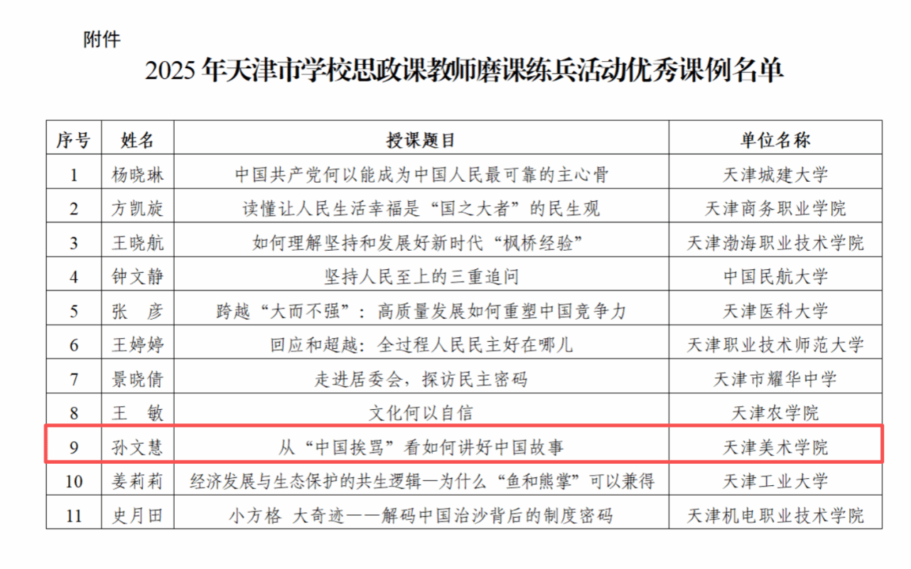 近日,2025年天津市学校思政课教师磨课练兵活动优秀课例结果正式公布,我院教师孙文慧凭借《从“中国挨骂”看如何讲好中国故事》一课,在全市25名优秀思政课教师中脱颖而出,其课程最终获评2025年天津市学校思政课教师磨课练兵活动优秀课例,为我院思政课高质量发展再添一笔成绩。